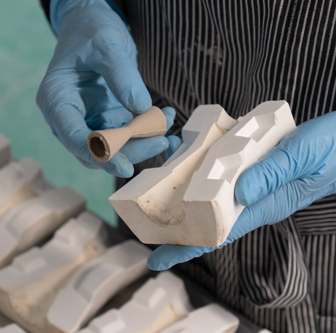 Frustumはお茶の良さを再認識するために、現代の暮らしに合わせデザインをリモデルした茶器。 お茶のある空間には「食」もあると考え、持ちやすい形状のFrustumシリーズに箸置きをラインナップしました。使わない時は立てておき、箸を置くと安定する少し遊びの効いたデザインです。